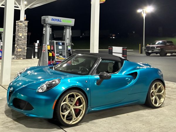 This 4C Spider was originally yellow, but when only a few months old it was vandalized with a caustic liquid. The next owner fixed the car's cosmetics and interior, and then repainted it a blueish teal. It is the only 4C this color and it catches eyes readily. The car has just 4,500 miles as of the summer of 2025.